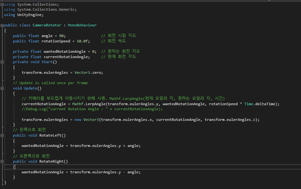 부드럽게 구현하기 위해 Mathf.LerpAngle을 이용하였다.