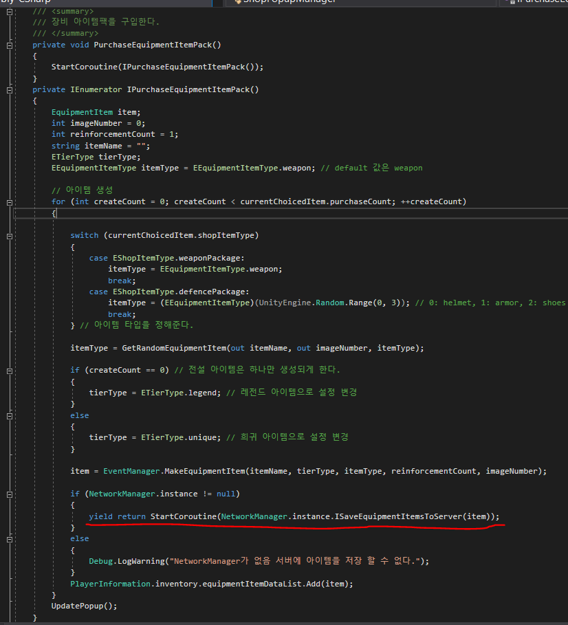 ShopPopupManager.cs에 PurchaseEquipmenetItemPack() 코드를 보면 NetworkManager에 ISaveEquipmentItemsToServer()의 코루틴 함수를 실행시키는 것을 11번 반복한다.